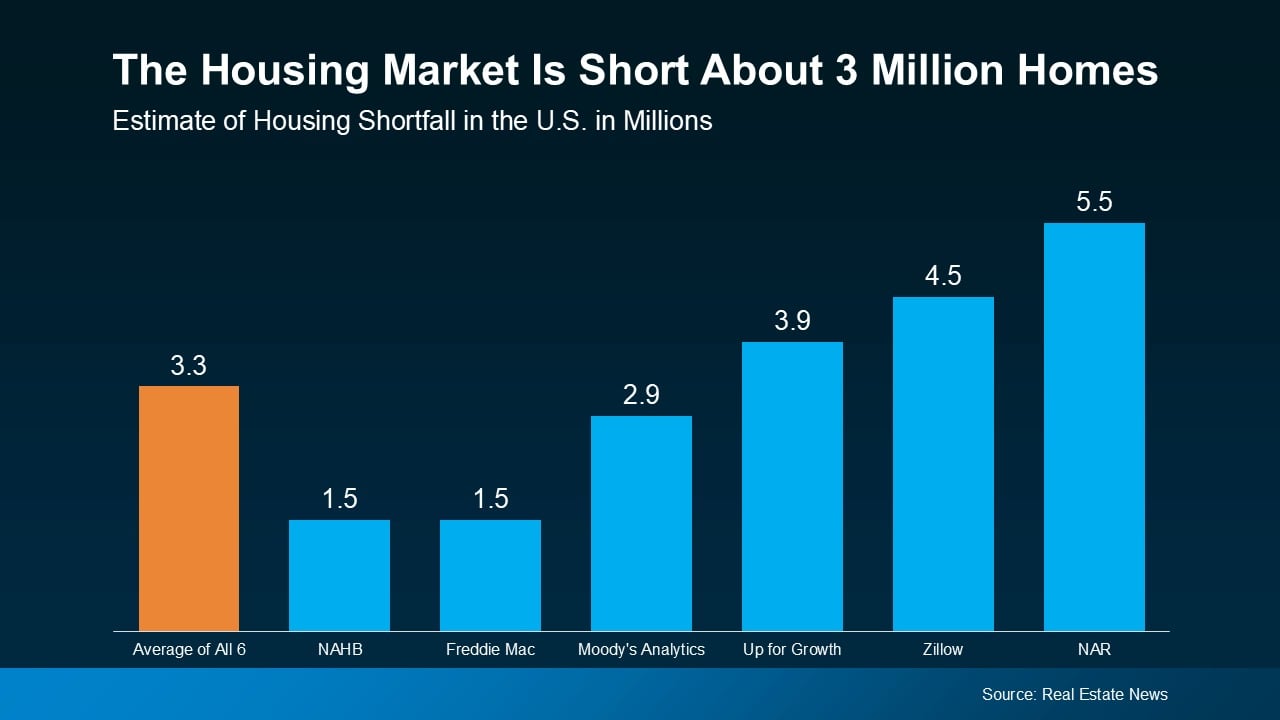 According to estimates from Real Estate News, the U.S. is facing a housing shortfall of roughly 3.3 million homes, based on an average of several expert insights (see graph below):